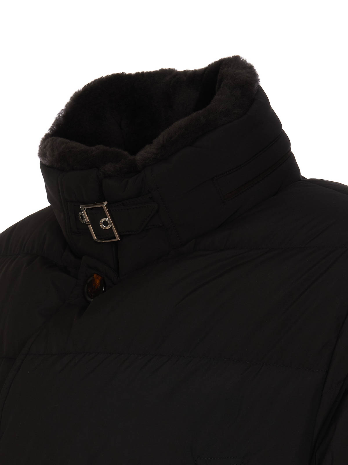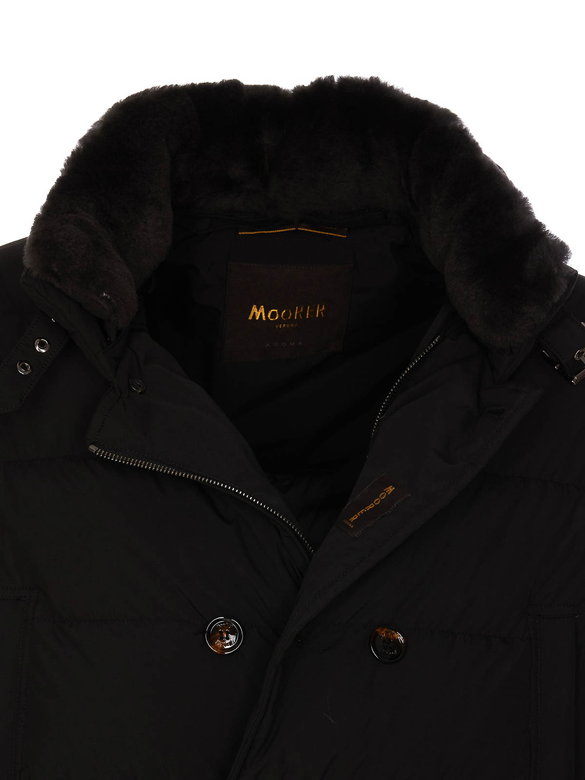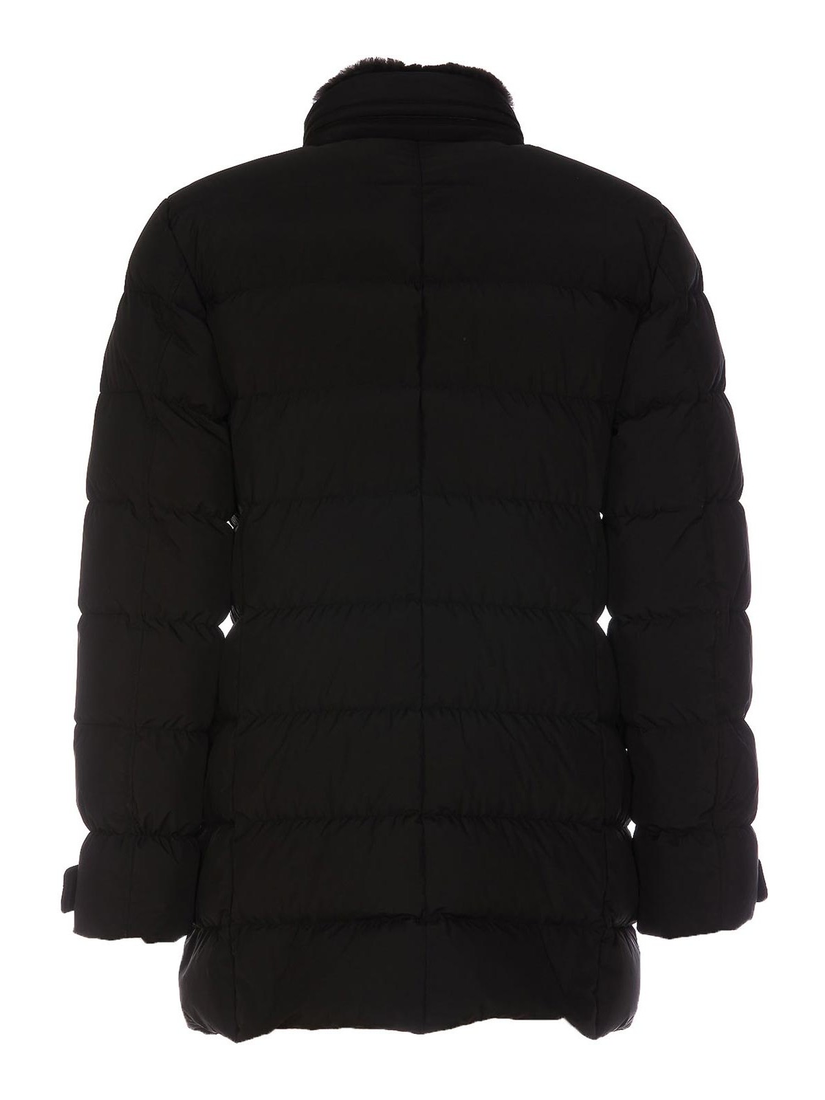 Moorer black down jacket with frontal zip closure double breasted button closure high neck strap on collar frontal pockets l sleeves strap on cuffs