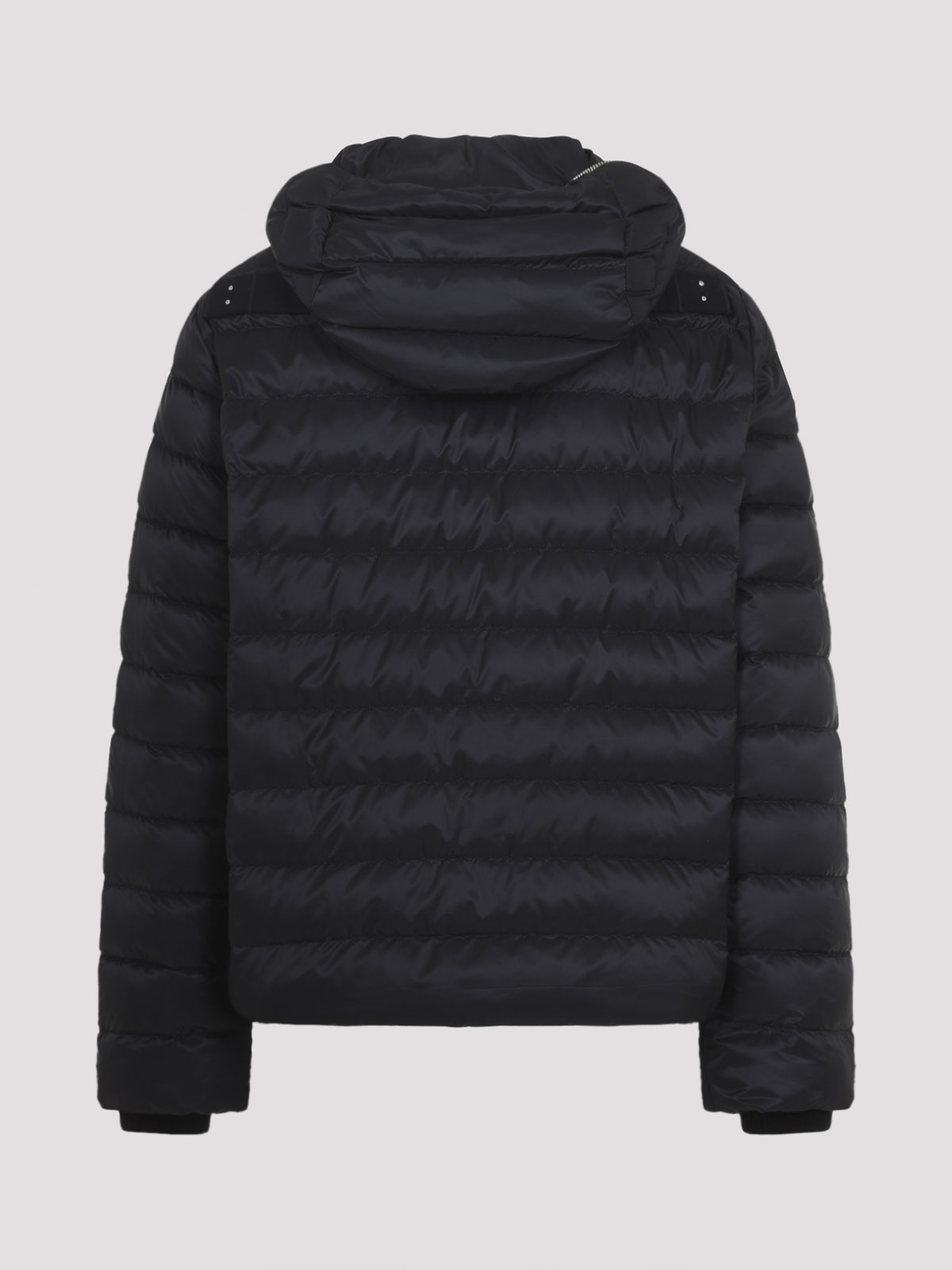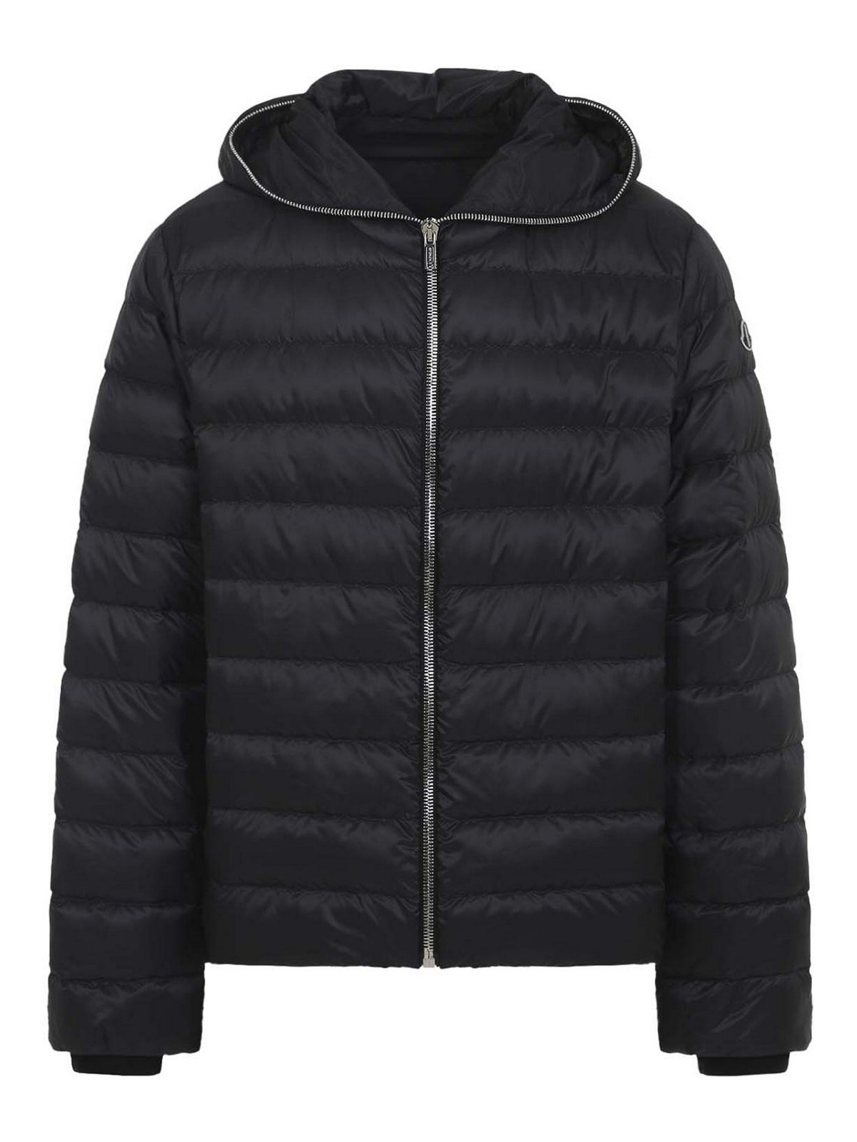 Moncler x rick owens black ziplock jacket. black recycled ultra-lightweight polyester, hip length with long sleeves and has a loose fit. centre front metal zipper that runs up and around the fixed hood, so that it can close completely over the face. rib knit wool blend inner cuffs and side snap-welt pockets. cotton webbing strap with rivet detail on the back yoke and has a moncler + rick owens embroidered logo patch on left arm. lined with recycled ultra-lightweight polyester and has interior pockets with snap closures. lightweight down-filled.